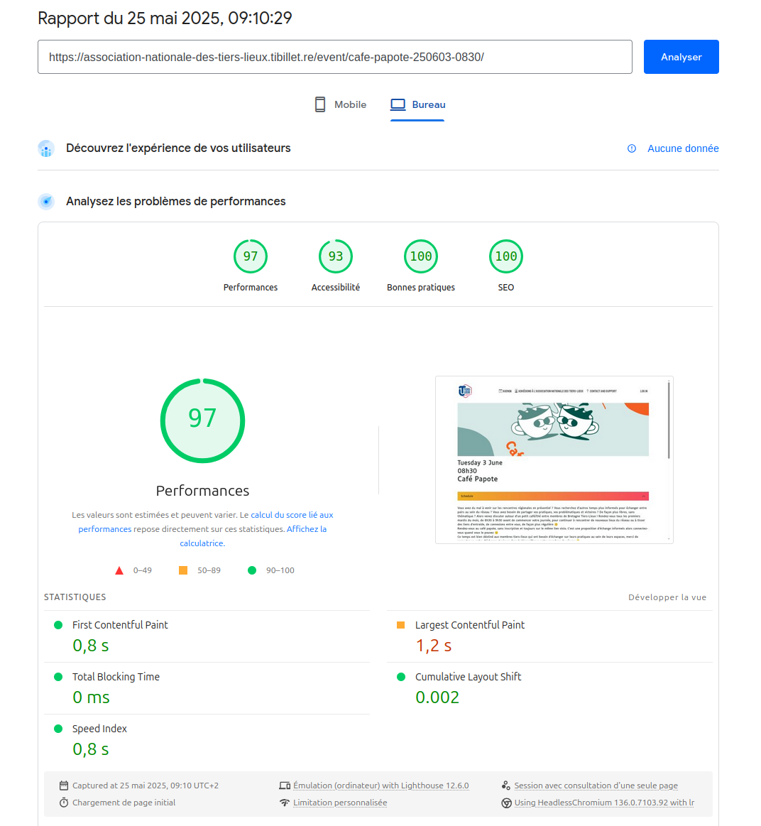 Partagez vos évènements sur les réseaux, ils sont tout beaux ! Enfin des vues jolies pour donner envie de cliquer dessus. Et surtout, une optimisation bienvenue pour le référencement ! Nous atteignons de jolis scores sur l'outil de Google (cf capture d'écran)