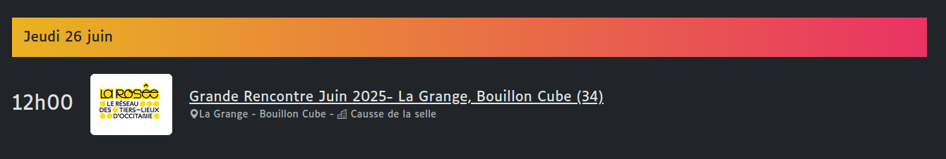Suite à une très bonne idée de @Laura de l'ANTL, nous avons rajouté des images et vignettes sur les adresses. L'idée est d'utiliser ces dernières si les images ne sont pas présentes dans l'évènement. Beaucoup plus lisible, surtout dans des agendas fédéré. Merci !