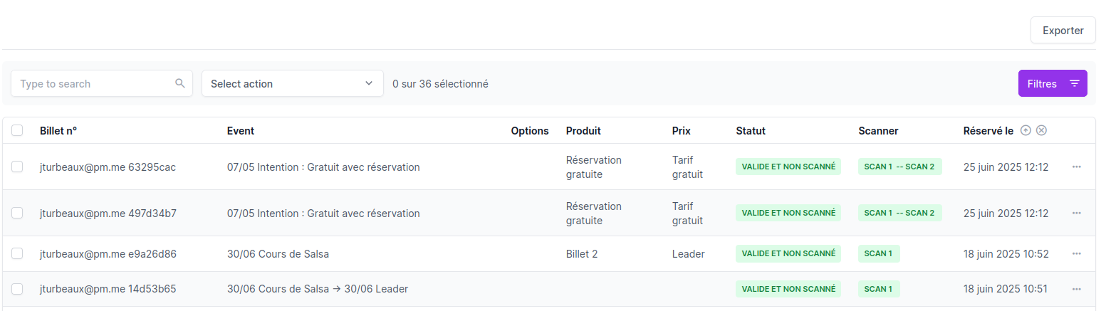 Pour valider vos billets, vous pouvez désormais exporter toutes vos réservations en fichier CSV utilisable dans un tableur. Vous pouvez aussi valider le passage directement sur l'administration. Vous recherchez la personne avec son nom ou son mail, et vous validez sa présence ou la présence de tous les billets de la même réservation en une seule fois !