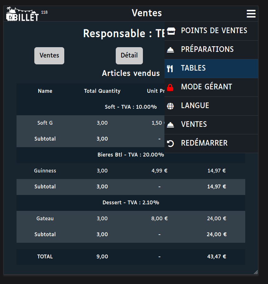 Accédez à plus d'information sur vos ventes directement depuis l'interface de l'application et non plus uniquement via l'admin. Vous pouvez classer par catégories et vous n'avez accès qu'aux ventes que vous pouvez réaliser (le food truck pizza peut voir en temps réel ses ventes pour mieux gérer ses stocks, par exemple)